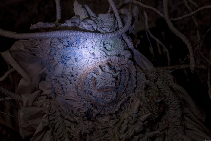 2017-2018年,邬建安遍访贵州织金、雷山、丹寨、凯里、台江等地。在山间的穿行中,他逐渐意识到都市与乡野、传统与当代、制作与创作并非两极对立,文化的真相从来不是一种声音。《事苗》展览中,邬建安扮演了四重角色:调用苗族传统工艺的再创造者、贵州本地艺术家的发掘者、引领苗族手工艺者自我突破的先行者,和指导青年学生与苗文化碰撞的教育者。500根在贵州丹寨蓝靛染缸中浸染过的蓝竹被邬建安建构为一个“巨人”的隐喻:巨人如同巨大的文化母体,承载着古人的遗产,激励着今人的创作。
