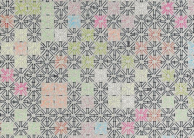 自1993年丁乙的几件黑白十字作品在威尼斯双年展展出后,他的“十示”概念愈发渗透到全球观众的视线当中。“十示”以一种符号化的抽象语言表达构成了艺术家个人的视觉叙述逻辑,这一语言符号不仅凝聚了丁乙对当代社会和艺术创作的切身体验,更在图式的背后蕴寓了他对创作题材、形式、媒介和语言的精密剖析及大胆实验。E.H.贡布里希爵士通过对“秩序”知觉的深究,发现主张知觉有趋向于简单形式倾向的格式塔心理学与自己对“中断”秩序的理解发生差异:正是在秩序或非秩序中出现的新变化中所存在的一种张力,在此基础上的有机体慢慢生发出一种新的秩序感,并以此来充当知觉活动的框架。丁乙的“十示”便给予我们装饰图样和秩序感的一种启示和表达。十字图案是他一直坚持的主要视觉符号,当他专注于形式的重复、解构、极简、抽象等话题,我们仿佛能够在丁乙身上嗅到蒙德里安的艺术气息。在他的画面中,一方面不断尝试单色、淡色、荧光色等色彩的千变万化,同时对布面丙烯、格子呢、纸上粉笔、木炭、彩色铅笔等媒材和介质进行深入浅出的斟酌和把玩。诸如此类的探索让他单纯的主题演绎出了丰富的变化,从理性逻辑中的抽象表达,到重复和并置下的画面秩序感,让丁乙的作品蒙上了一层神秘的面纱,引人不停地追随着他的图式而产生对当代抽象艺术的热情和好奇。