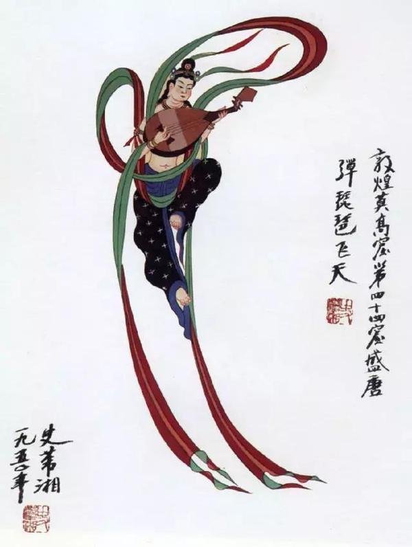 飞天怀抱琵琶右手拨弹,全身凌空向上飘举。