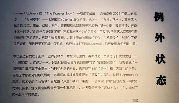 本次展览目的在于汇集一些作品样本,并在此范围内,再次讨论一个被讨论多次的主题——“中国元素”。但是这一次,讨论的的重心由形式创造移向了“眼前的问题”,也就是说“中国元素”既不是完全意义上的形式创新的问题,也并非完全的“身份”和“方法”的问题,而是艺术家面对自身问题时,有意识的选择或无意识的“抓取”。显然,按照Hoptman的观念,艺术史的“地质学”已然由“深度”转向“平面”,艺术家们的作品也处在不同的年代沉积层中。这次展览将聚焦于同一个沉积层中,并考察是何种“运动(合力)”,造成了这一沉积层的生成。