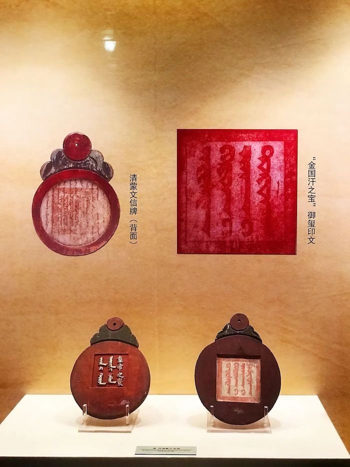 “武备法器国史载体”单元中,展出的皇太极时期弓箭、信牌及宗教用器,见证了清朝开国历程。