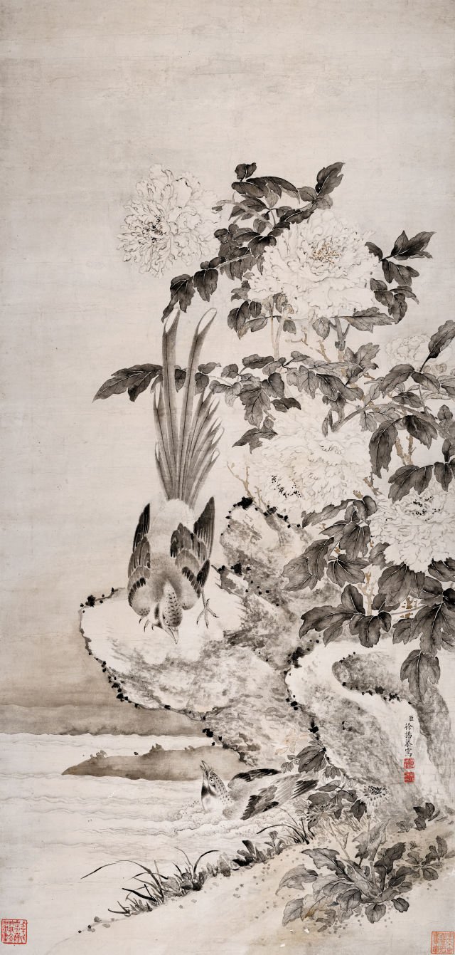 清 徐扬 牡丹山鹧图轴(牡丹双鹤)纸本117x55.8