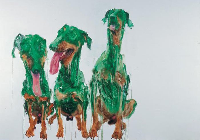 周春芽:在我的创作里面,画绿狗我没有考虑传统,画绿狗是一个全新的发现,包括色彩、力量、造型、构图、思想。桃花严格讲虽然是中国传统的题材,但是我画的时候比较开放。画园林就稍微有点儿保守一点,但其实还是借用,我没有必要单纯表现这个园林,我也不是做园林的艺术家,没有义务重复一遍。我的所有的哲学思想体现在语言方式上,它是独立的,是区别于传统也区别于西方当代的。表现主义也是一种发泄,发泄得淋漓尽致,我还不是。