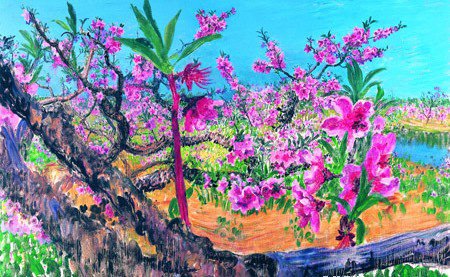 周春芽:画桃花从人性的角度思考得比较多,色彩很鲜艳,画起来比较自由;画园林就是另外一种感觉,更想把一些东西隐藏在画里面,把一些想法通过石头、树,通过笔触等表达出来,借鉴了一些传统艺术家的语言方式,难度也要大一些。画了几张以后,我又多次去扬州,通过对当时石涛、龚贤、髡残等艺术家那个年代的理解,寻找与他们画石头、画大自然的方式方法中的一些共同点。但是你也不可能完全去重复他们,重复也没甚么意思,比如说我对色彩的激情就跟石涛他们的创作理念已经完全不一样了。石涛是个和尚,有对一个朝代逝去的怀念,我还不是这样,我对传统的东西、对历史还不是眷恋的。这是一个契机,我在想为甚么石头、树是经久不衰的(绘画)题材?西方的当代艺术家也还在画──西方叫风景,我们叫山水画。之前我并没有意识到,是上次蔡国强和我对话时提醒了我,他说你是把风景当成静物来画,把风景中的某一部分,一个树枝、一朵花、一个石头提出来当成局部。但和静物又不一样,静物背后没有背景,是平面,我创作的时候同时想到传统的语言方式,用夸张的色彩表现出来,这又是和中国传统的“墨分五色”不一样的西方色彩的概念,我想把它们结合起来。