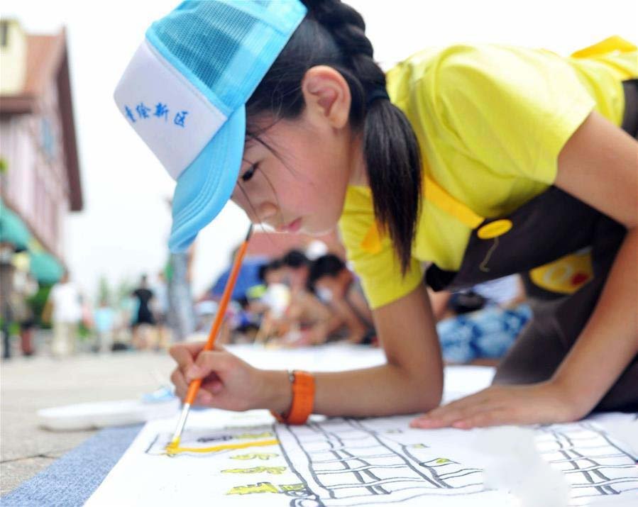 2017年8月5日,百余名青岛儿童在山东青岛金沙滩啤酒城的百米长卷上作画,描绘自己心目中的家乡。