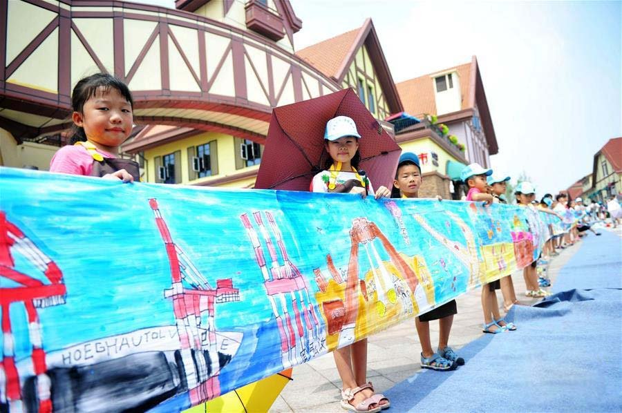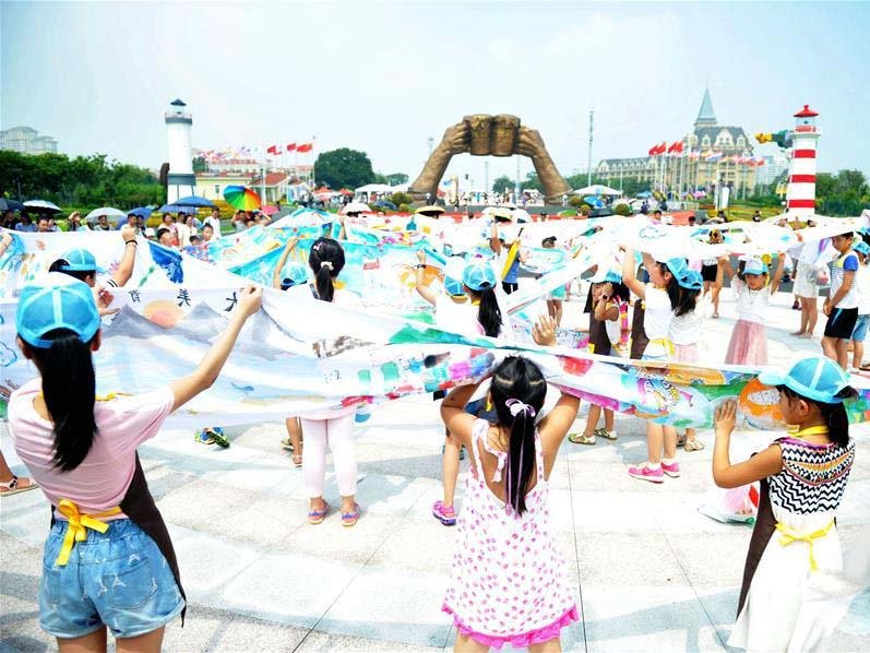8月5日,孩子们在山东青岛金沙滩啤酒城展示自己创作的百米长卷。