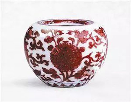苹果尊为清代康熙朝独特器形之一,形似苹果而得名。器呈侈口、底内凹、无颈、圆腹,器口颈若果蒂下凹于圆腹之中。苹果尊有缩颈和无颈两种,无颈的以釉里红为多,缩颈的以苹果绿和天蓝釉为常见。苹果尊为清代景德镇窑烧造,官窑器为多,大、小器物均有,品种有青花、釉里红、天蓝釉、窑变釉等。