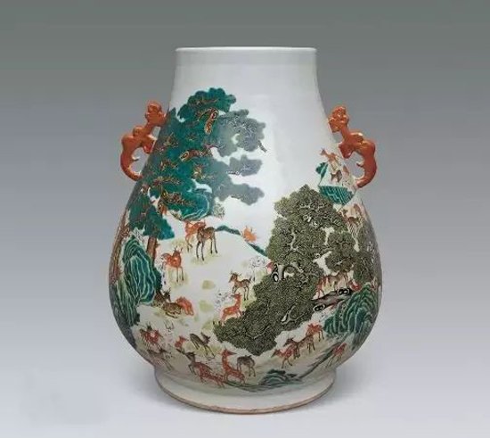 百鹿尊,又名“鹿头尊”始见于清康熙,至乾隆朝盛行。百鹿尊器形与牛头尊相同,大口,口以下渐放,垂腹,圈足,肩两侧有对称的兽头耳,通体绘群鹿,故名。百鹿尊品种以彩为主,晚清有仿造。百鹿尊收口,腹上敛下垂,夔耳,倒置器身若鹿头或牛头,故称之为“鹿头尊”或“牛头尊”。当时粉彩器多以青绿山林为景,绘十鹿或百鹿奔跑、穿行于山林之中,故亦称“百鹿尊”。