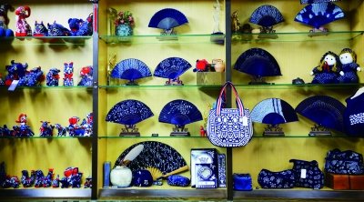博物馆设计得很巧妙,既有蓝印花布工具、原料的展示,又有历史、资料的介绍,既能观赏蓝印花布的制作过程,又能挑到自己喜欢的蓝印花布商品,集收藏、展示、研究、生产、经营为一体,并不像一般博物馆严肃、沉重,进入这里,一边了解蓝印花布的知识,一边亲手体验蓝印花布的制作工艺,不由得让人心生意趣、流连忘返。