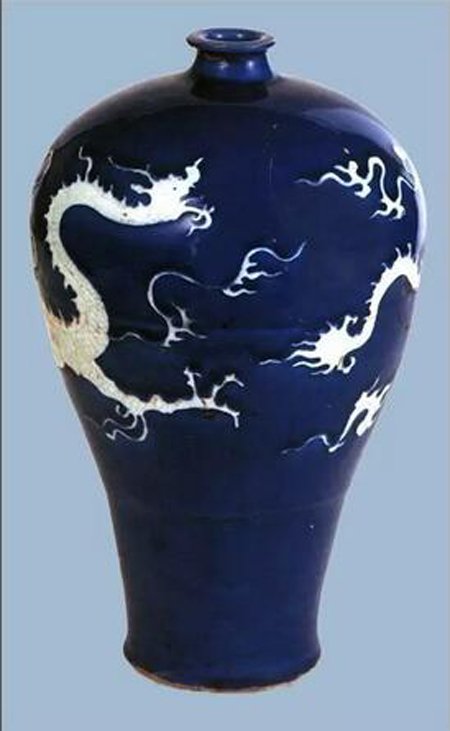 高温钴蓝釉瓷器是以钴作为着色元素,元代创烧的新品种,为明、清祭(霁)蓝、洒蓝等蓝釉瓷器奠定了基础。装饰上或饰以描金,或饰以白龙、白凤等纹饰,兼以刻、划花工艺。传世有梅瓶、盘、匜等器型。