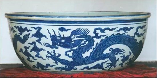 综合史料上的分析,正统时期烧造的龙缸很有可能是为防火患的消防水缸,也有说法为养荷、养鱼之用。颐和园收藏的此件龙缸年代也符合正统烧造龙缸的时代背景。烧造大口径的龙缸难度极大,即使到了明代晚期也不易烧造,曾出现过万历二十七年景德镇御窑厂窑工童宾被逼烧造龙缸未成,而殉窑的事件,可见其烧造难度之大。目前资料未见明代有超过94厘米口径龙缸的记述,颐和园收藏的明代早期青花云龙纹缸有着极高的学术研究价值,可谓撼世之宝,龙缸之王。