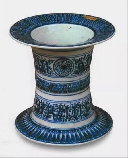 永乐青花无挡尊,口径17.2厘米,底径17厘米,高17厘米。尊身中空为筒状,上、下口部宽折沿。器物整体纹饰布局,呈带状装饰,口和底沿饰以菊瓣纹;尊身上、下绘以缠枝、团形图案及阿拉伯文;中间饰以仰、覆莲瓣纹。永乐、宣德官窑青花瓷器使用进口的苏麻离青,青花发色鲜艳古朴,有晕散效果,铁锈斑痕迹明显,而此器亦同。无挡尊是仿阿拉伯铜器造型制作,乾隆皇帝曾作有两篇《咏宣德窑无挡尊》诗文,其一:
