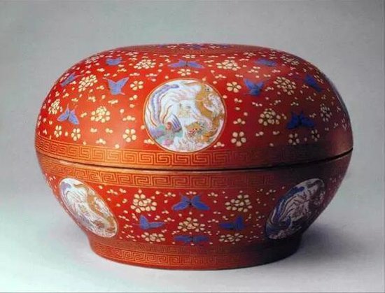 颐和园藏同治红地粉彩开光龙凤纹捧盒