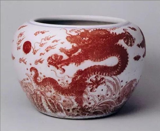 康熙青花釉里红云龙纹缸,口径35.6厘米,底径31.2厘米,高32.5厘米。敛口,丰肩,收腹,圈足。缸身绘有釉里红双龙戏珠纹,描绘技法以线绘为主,画工精细;龙形站立,张牙舞爪,异常凶猛,龙鳍如刀,龙身生动富于动感,龙尾如“蚯蚓”;釉里红发色鲜艳纯正,略泛绿斑。器身用青料绘以龙睛、山石、云朵、海水江崖和口、足界线;描绘技法采用线绘和晕染相结合,表现出康熙青花分水的特色,发色明丽,层次感鲜明;海水江崖气势汹涌,山石沉稳,云朵超然。此件瓷器将釉里红的主纹饰和青花的辅纹饰相结合,巧妙自然,主次分明。故宫亦收藏同时期、同工艺相类海水双龙戏珠纹缸,造型一致,纹饰一致,尺寸略有不同(口径32.5厘米,足径28厘米,高30.1厘米),除龙睛和口、足界线由青花表现,其它纹饰皆为釉里红。此种缸为堂子、祭殿等祭祀时盛酒水之用。