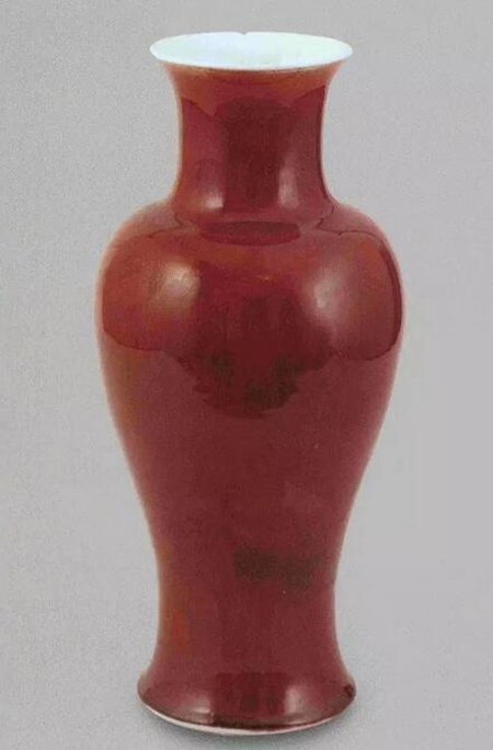 郎窑红釉是康熙晚期景德镇仿烧明代永乐、宣德时期鲜红釉瓷器而产生红釉新品种。康熙四十四年至五十一年,江西巡抚兼景德镇御窑厂督理主持窑务,由于清代官窑瓷器常以督陶官姓氏冠以窑名,所以在郎廷极为督陶官期间创烧的红釉新品种,称为郎窑红釉。郎窑红釉瓷器,以氧化铜为着色剂,生坯挂釉,入窑经1300℃高温再还原气氛中一次烧成。郎窑红釉瓷器造型以瓶、尊为主,尤以观音尊最有特色,釉色鲜红,颜色随垂流逐渐加深,釉面清亮,玻璃质感较强,釉面有开片、鬃眼和牛毛细纹,口部釉薄露出胎骨白色,红釉垂流通常不过底足,有“脱口垂足郎不流”之说,底足为“米汤底”或“苹果绿底”,偶见红釉底,一般不署款识。