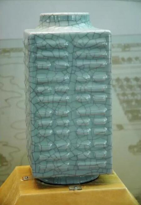 道光仿哥窑琮式瓶,高约26厘米,瓶身宽11.5厘米。圆口,短颈,方身,圈足。该造型取自古代玉琮,宋代开始仿照玉琮造型制作瓷器,故被称之为“琮式瓶”,元、明、清瓷器造型延续了此品种。清代乾隆时期烧造的仿哥窑琮式瓶较为常见,此件道光仿哥窑琮式瓶只是继承乾隆风格,瓷器釉面开片均匀自然,略泛青亮色,器身的方形四面均模印凸出的八卦符号,表面看来不过是瓷器造型吸收了其它的一些元素,其实更重要的是将中国传统哲学思想、美学观念融入到瓷器造型中。此种瓷器造型和玉琮一样,同为口、足圆而外身方,象征了天圆地方;哥窑开片风格更突出表现了传统道教“大成若缺”的美学思想;器身模印的乾、坎、艮、震、巽、离、坤兑八卦符号,象征了自然界天、水、山、雷、风、火、地、泽八种常见物象,而八卦又演绎万物构成了世间,与内圆外方象征天地的造型相合,将“器”与“道”合而为一,将传统思想物化为大成之作,其经典之处远远超乎了此件瓷器之本身,而是以其为缩影代表了中国瓷器的最高的水平。