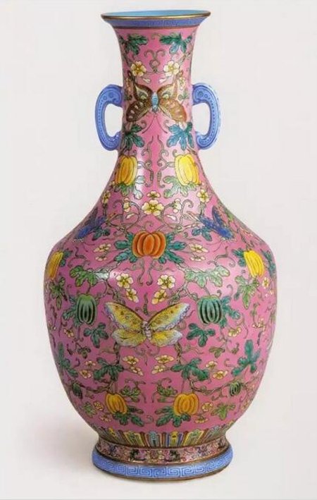 乾隆粉彩瓜瓞纹如意耳瓶,口径8.5厘米,底径11厘米,高35厘米。侈口,长颈,如意耳,鼓腹,圈足。该瓷器口部描金,口边、足跟外侧绘以回纹,瓶内施以松石绿釉,整件器物通身以胭脂红色为地,描画了26只瓜和10只蝴蝶,瓜蝶交织,蝶舞其中,布满器身,画工精细,寓意吉祥;底足落有“大清乾隆年制”六字三行篆书矾红款。“瓜蝶”取谐音“瓜瓞”,“大者为瓜,小者为瓞”,其寓意出自《诗经·大雅·绵》中“绵绵瓜瓞,民之初生”,原意为赞颂周民族子孙繁衍生息不断,后来引申为子孙昌盛、多子多福之意。在瓶颈部绘画的蝴蝶图案中,蝴蝶双翼上的纹饰好似猫的两只眼睛,故称之“猫蝶”,取谐音“耄耋”,又有长寿之意。此件瓷器体现了清代彩瓷纹饰“图必有意,意必吉祥”的特点。