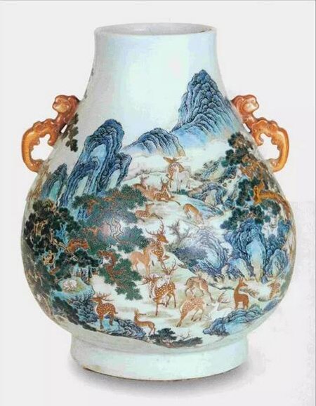 乾隆粉彩百鹿尊,口径16厘米,底径24.3厘米,高43.6厘米。收口,螭耳,圈足,腹部上敛下垂。造型独特,形体规整,釉面匀净,描画极为精细,且颜色鲜艳丰富。百鹿尊造型似鹿头,康熙时期出现,亦称“鹿头尊”,其上描绘百鹿,“鹿”字与“禄”谐音,有福禄、官禄之意。画面中鹿的肢体、斑纹描绘真实生动,尤其是鹿身上的细毛,丝丝可见。背景中的山石、浮云意境高远,将传统国画山石皴法运用其中,表现出山峰的险峻。百鹿尊耳施以珊瑚红,粉中泛白,透出瓷身之色,质感柔和。底足款识为“大清乾隆年制”六字三行篆书青花印章款。此器在乾隆、道光、光绪官窑均有烧造。