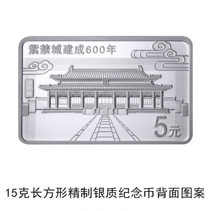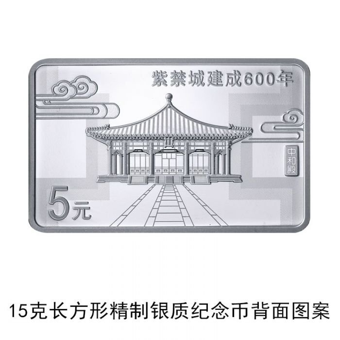 15克长方形银质纪念币3枚,面额5元,长32毫米、高20毫米,每枚发行30万枚,3枚一共90万枚,背面图案分别采用紫禁城三大殿,即太和殿、中和殿、保和殿建筑造型。