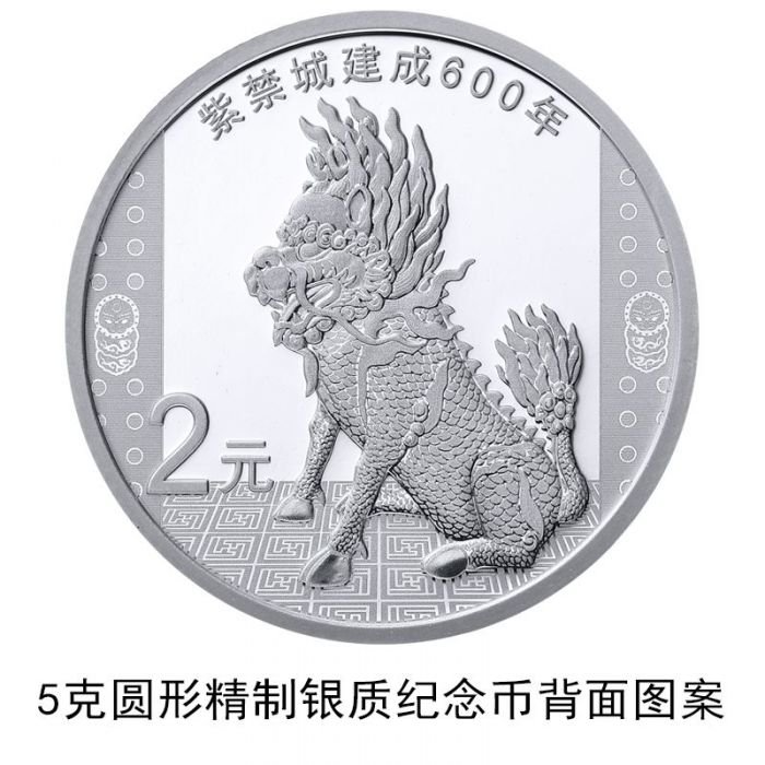 5克圆形银质纪念币,面额2元,直径22毫米,最大发行量200万枚,背面图案采用铜麒麟。铜麒麟的图案取自慈宁门前的一对鎏金铜麒麟。