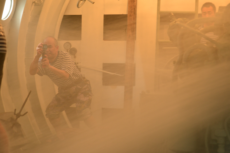 作品的主题明确,就是习近平主席定位的“临危不惧,处变不惊”的372精神,艺术的表达也就围绕这八个字展开。我们很快放弃了浮出水面的潜艇,蓝色的大海,飞溅的浪花,迎着朝阳,升起国旗、军旗胜利返航。[