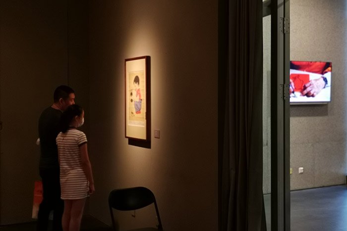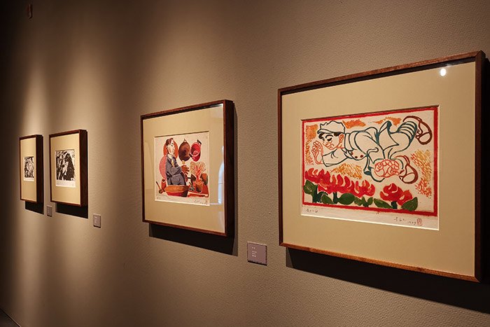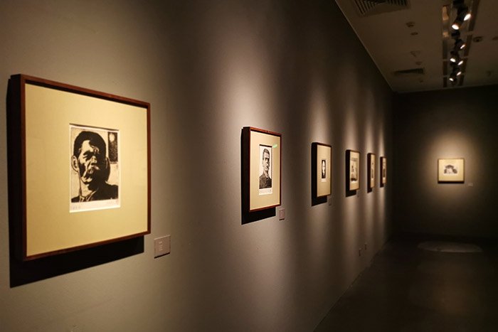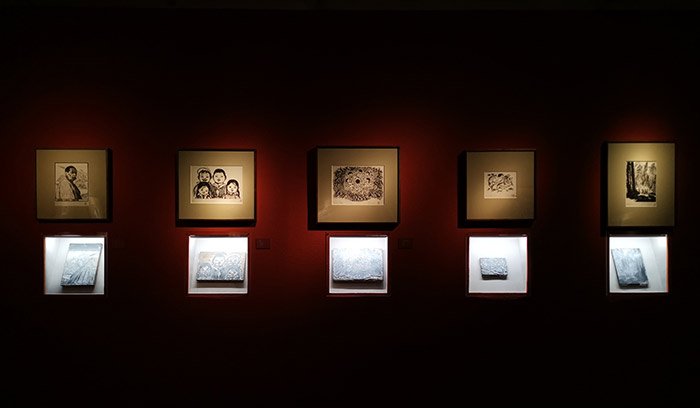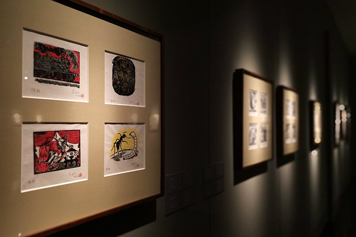 北京画院美术馆三层展出的黄永玉部分版画及木刻板