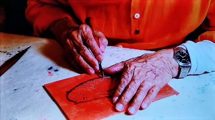 黄永玉木刻过程视频截图,这是一双刻过无数木板的手