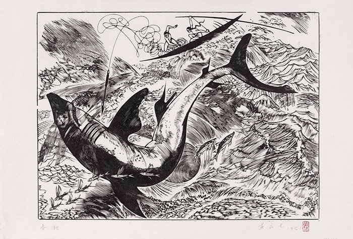 这幅作品刻于1961年,整幅是一个线的世界,多组线条排列疏密有致,却又纵横交错,营造出在大海之中浪花翻腾、千钧一发的气氛,画面正中央是一只巨大的黑鲛,它极度扭曲的躯干翻搅起漩涡,蕴含着巨大的能量,远处则是一叶小舟,两名青年人,一名努力撑桨,另一名则奋力向鲛鱼投掷巨大的刺钩,系着刺钩的绳子弯曲缠绕在空中,宛如整段恢弘交响乐里的一小段轻快华章,左下方一排飞鱼在空中掠过,似乎代表着即将胜利……
