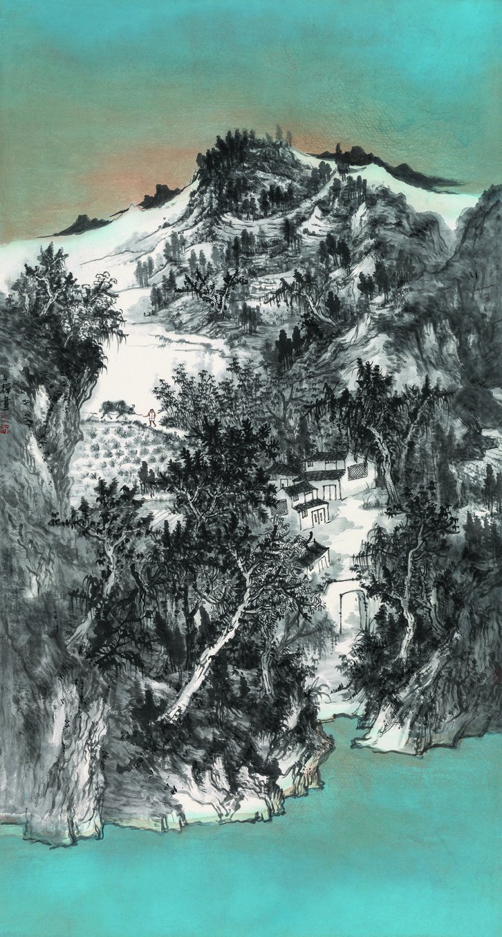淡淡流水意 依依田父情(国画)左文辉 136×136 2014