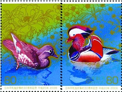 日本被称为“樱花之国”,樱花是日本国花。日本历年发行的日中友好题材邮票也多次出现樱花的身影。2002年9月13日面世的一套2枚《日中邦交正常化30周年纪念》邮票,其中“源远流长”票图描绘两条金鱼畅游于落满樱花的水中。细数一下花朵数量,恰好是30朵,契合邮票主题。2008年8月12日推出的一套10枚《日中和平友好条约30周年纪念》邮票,其中2枚邮票以连票形式构成一个画面,描绘在水中嬉戏的一对鸳鸯,背景用金色线条勾勒出樱花图案。2012年9月4日发行一枚《日中邦交正常化40周年》邮票,主图由樱花、牡丹花与祥云构成。