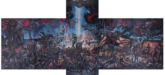 后全球化时代意味着全球新秩序在孵化未知的雏形,在未知因素的变化中上建构的未来,我们生活的世界充满着不可琢磨的因子,艺术家用其超前的敏锐知觉触碰到了时代的痛点,用图像文本言说一个真实而又魔幻的当下。