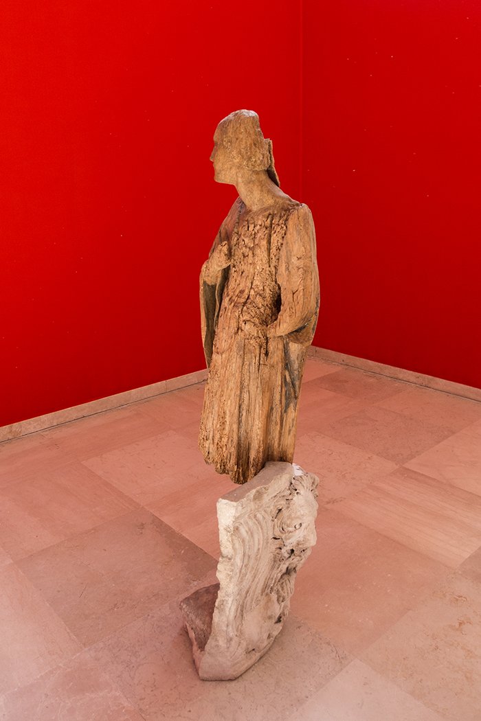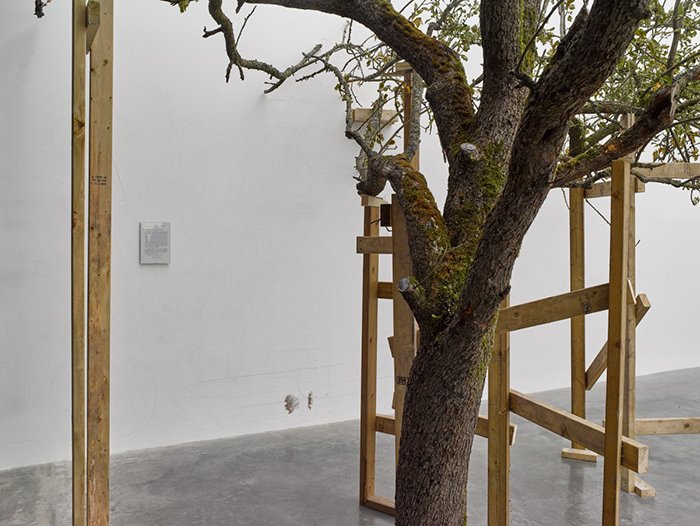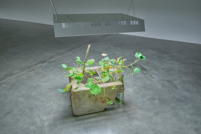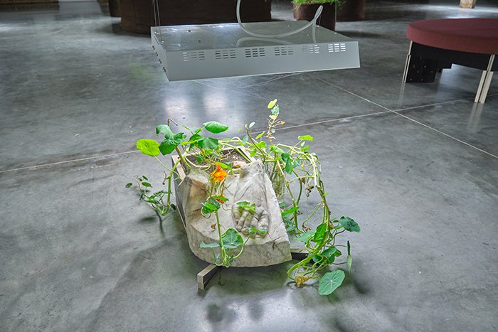 本次展览的核心作品均是2020 年的新作,它们始于 Güldenhof,一个位于德国东部的农场,那里汇聚了傅丹近年来探索的诸多主题,譬如天主教的传播和如今流行的品牌文化输出的内在联系又或是伊甸园式的人类基本渴望。走进细看才会发现许多长满植物的“容器”其实包括了公元 1 世纪的罗马雕塑残片、17 世纪的佛兰德大理石装饰、2 世纪的罗马石棺的一角或者是 18 世纪的爱神丘比特木雕的身躯。傅丹也曾坦言他的作品中将许多物件组合在一起并非是一个“合理”的选择。在这些作品里,所谓合理的组合即为陷阱,意在将这些物件从它们的几百年所扮演的角色中跳脱出来,打破这种“惯例”。诚然,傅丹的作品十分依赖于大段文字上的描述和叙事,通常在他的作品旁边会带有大段晦涩难懂的历史背景和说明,他似乎有意在引导观者的逻辑,这让我想起博伊斯和他的油脂椅子,暂且不论博伊斯杜撰与否,恐怕若是没有飞机失事被鞑靼人用黄油所救的背景故事估计恐怕这张油腻腻的椅子很难引起观者们对于徘徊在生死之间的情感的共鸣。