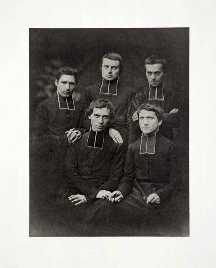 仅一廊之隔,对面墙上则悬挂着一幅由铜版照相制版技法制作的肖像,这件作品被命名为《Bye bye(永别)》,正是百年之前一同前往越南布道的五位传教士的行前拍摄的肖像。画面中五张年轻且虔诚的脸,则将永远的注视着墙上的基督,不由的惊叹于艺术家傅丹精妙构思以及策展人对于白立方展厅空间的利用。也正如傅丹在2019年在南伦敦画廊 South London Gallery 个展时的采访中提到的那样,“我将作品命名为无题,是为了不要去强调单一作品个体,而是开放不同项目之间的多样性的联系”,当几件作品中隐藏的联系被一层层剥开,作品诉说的故事也渐渐明朗而又极富余韵。
