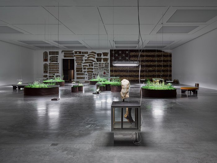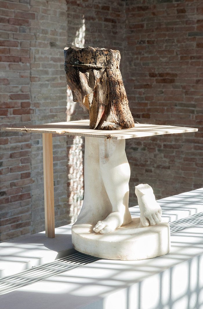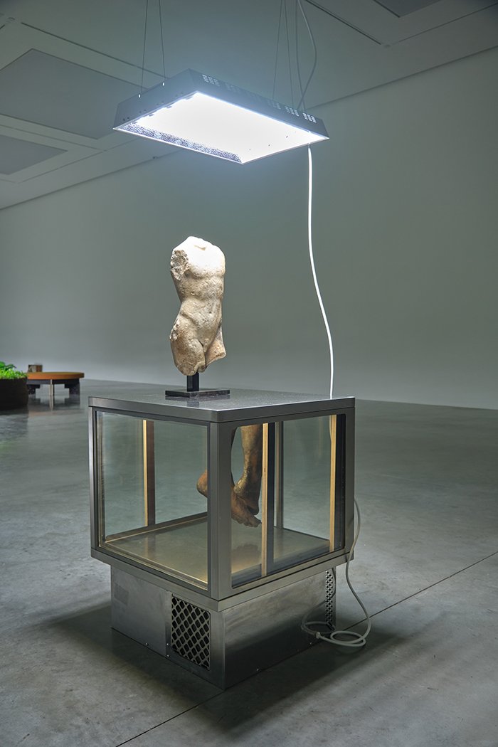回顾近几年的傅丹在世界级的美术馆以及蓝筹画廊的个展,亦或是威尼斯双年展这样的展会,雕塑的形象也在悄然发生着变化,局部的拆解和重构,流行文化的拼接,完整的形象在不断的消解着,同时也避免了“健美”式的作品堆砌。直到植物的引入,强调了作品的动态属性,即事物在每个历史时间上所不同的含义。随着展期的进行,植物是否会枯萎我不得而知,但是就算植物凋亡又有何妨呢,雕塑的碎块作为历史的痕迹何尝不是历经时间洗礼直至“凋谢”,却又被艺术家重新赋予了新的角色吗?傅丹强调个人经历对于创作的重要性,他的自我意识并非一成不变的,它与人,与记忆,与境遇不断地交织着,与历史,身份,政治,宗教乃至文化建立着联系,他将这种状态为定义 “流动”。傅丹的艺术作品的多元性,也使得他站在一个更高的框架中去调侃,去回应,去讽刺,去诉说,通过语境的转换去探讨现成品的象征性意义。