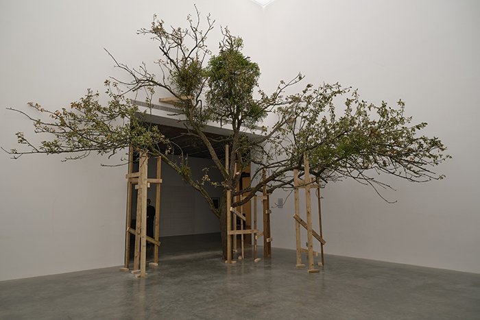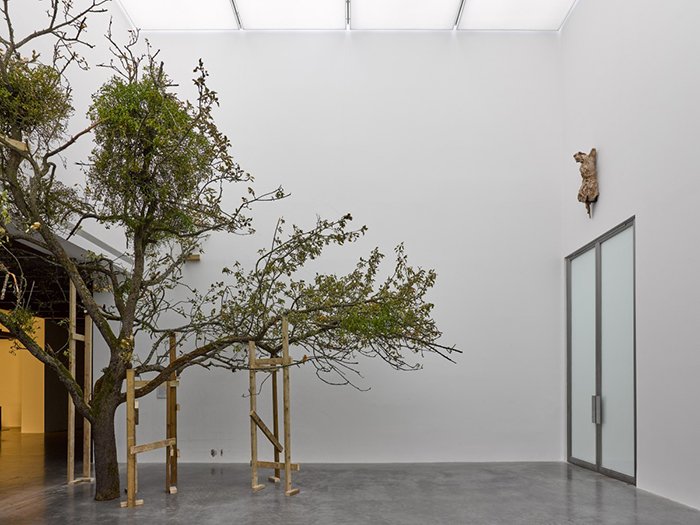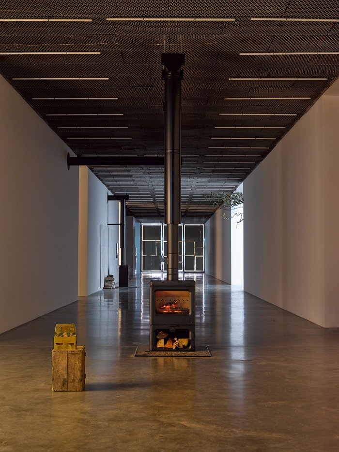 白立方南展厅里的植物的加入对傅丹来说是一种全新的语言,在我看来是避世的,未来的,对展览主题的呼应,对生命本源的暗示,与北厅厅里燃烧的炉火是一种逆向的表达。破损的雕塑在傅丹的创作中是一个十分常见的元素,它常常隐喻着宗教文化中的“理想”形象。