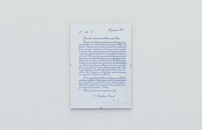 傅丹的多数作品体系建立在杜尚的“现成品”观念之上。正如当初杜尚的作品“泉”那样,这一类观念导向的作品十分依赖于文字解读,作品本身的叙述并非大开大合,直抒胸臆。当一层层去挖掘和剖析之后方才能悟到作品的迷人的之处。从 2009年开始的作品 《2.2.1861 2009—》,傅丹请他的父亲 Phung Vo 抄写了一份法国天主教传教士的遗书,这位传教士在越南因为‘传播异教’的罪名于 1861 年 2 月 2 日被处以极刑。这封 1861 年 1 月 20 日写给传教士父亲家书成为了这位传教士的绝笔,在信中,年轻的传教士将自己比作春天从花园里摘下的花朵,如此温柔诗意而又饱含炽热情感的文字在百年之后由一个陌生的,并不懂法语的越南人一遍又一遍的书写出来,傅丹将这封家书转化成一个纽带,呼应了自己与父亲的关系,营造出对于文化,信仰与宗教的执念。