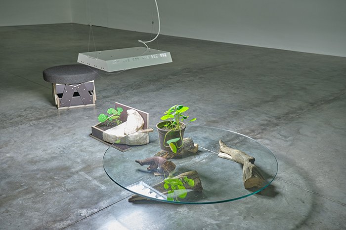 走进更大的南展厅时的第一感觉仿佛走进了一个太空科幻电影里才会出现的种植舱,昏暗的环境里从天花板上垂下许多极具工业气息的照明灯,抵近照亮了一些种植着植物的容器和收集来的木雕。