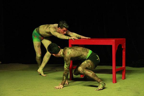 主展厅“戏”空间内嵌对于中国传统戏曲文化的挖掘,而对京剧《三岔口》的梳理则为核心关注。 《三岔口》的故事情节简单,但其在昼亮的聚光灯下表现出伸手不见五指挥刀格斗场面,可谓是中国戏剧“虚拟”表演最具代表性的呈现。展厅中,李文培和马驰分别用宣纸水墨纸本和新媒体动画的形式还原了《三岔口》“做”“打”的经典表演。郝俪,黄琦馨、丁文尧则是以《三岔口2015》《三岔口2016》《三岔口2017》为创作蓝本。此系列戏曲作品是戏剧艺术家周龙试图将传统与现代、古典与时尚交融并蓄,融唱念做打于一体富有浓厚喜剧色彩的演剧样式。展厅中, 周龙以两把“红桌子”的舞台景置形式,形成一种简洁自由的舞台空间。观者走入,恰似置身于舞台之中。空间配以灯光手段的变换,使观者沉浸在剧场的氛围中,拉近了与观众的交流距离。其作品《三岔口2017·舞》则是拓展剧场空间可能性的最新尝试,舞者的肢体语言诠释了一种独特的艺术表达。