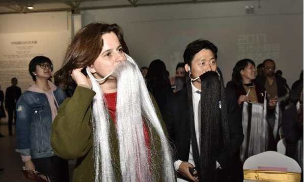 展览开幕观众佩戴髯口,现场互动体验