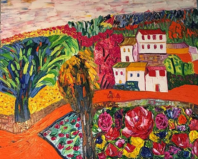 意大利著名的马赛克艺术家、鉴赏家、收藏家塔库尼.马洛先生说:天馨的画有的像流动的音乐,非常美丽美妙!有的作品像梵高的作品,尤其这幅!他喜欢画的山水画,喜欢花,挂在家里很喜悦!他希望天馨每天都能画画。